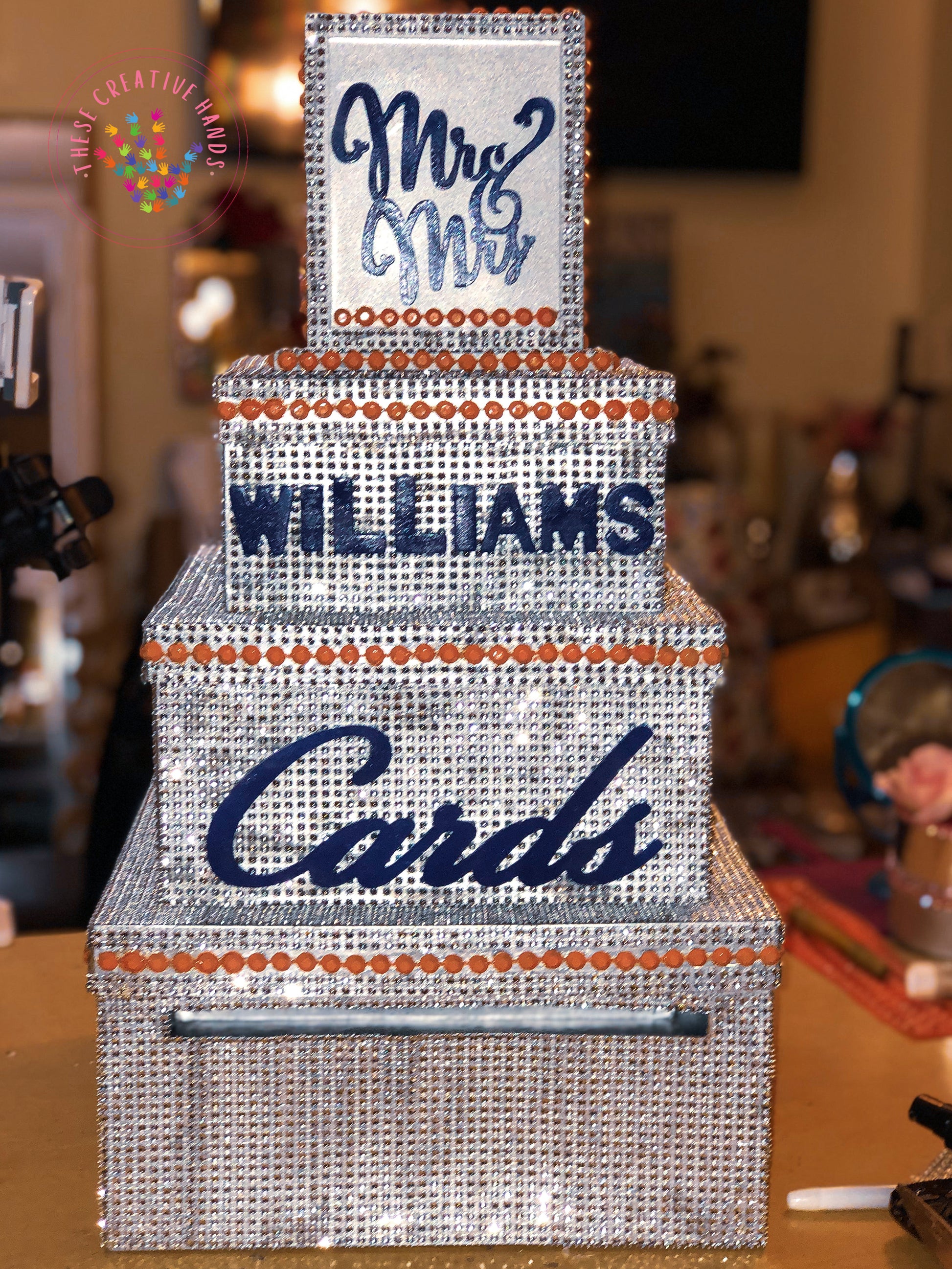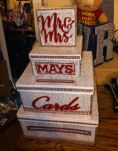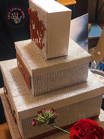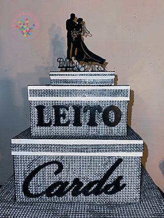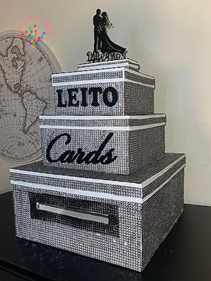 The fabulous three tier box is large enough to hold many cards and some small gifts and will be an unusual talking point on your wedding day. It will provide a feature point for your guests to deposit their cards and, being made from paper mache, it is sturdy enough to be used as a storage or keepsake box after the event. Of course, it can also be personalized for other special events such as anniversary parties and 'big' birthdays. It has a large slot in the side allowing for easy posting and the lid lifts off to access the cards inside.